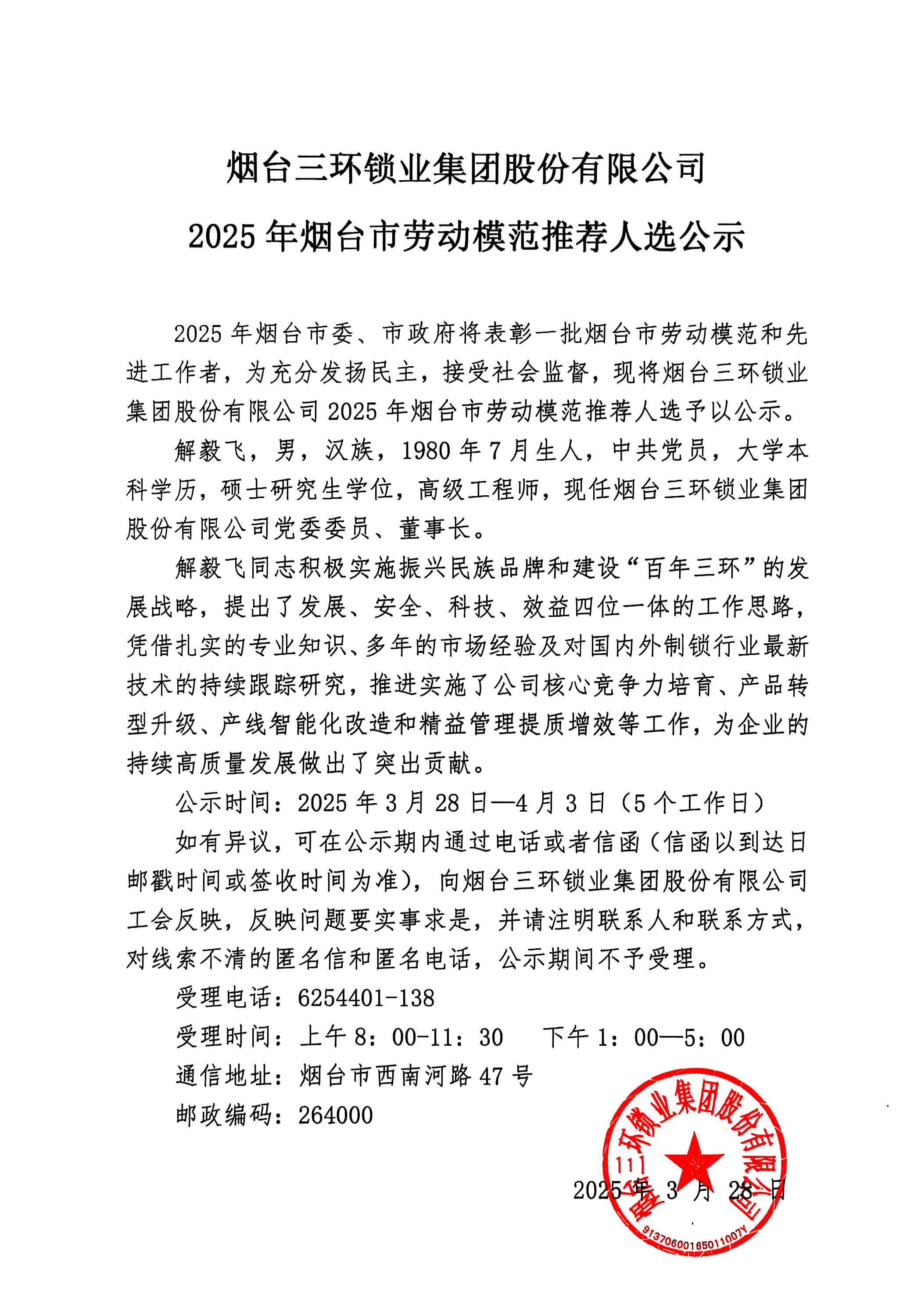 煙臺(tái)三環(huán)鎖業(yè)集團(tuán)股份有限公司 2025年煙臺(tái)市勞動(dòng)模范推薦人選公示